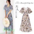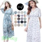 マキシ丈ワンピース 半袖 カシュクール ウエストゴム vネック バックリボン 花柄 シフォン レディース リゾート ビーチワンピース ロング