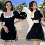 水着 ワンピース 半袖 体型カバー レディース オールインワン パフスリーブ Aライン 服見え フラワーモチーフ スクエアネック 海 黒 白