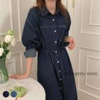 デニム ワンピース ロング 長袖 レディース おしゃれ かわいい 春 秋 Aライン シンプル カジュアル ウエストマーク