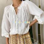 レディース ブラウス 長袖 シャツ トップス ランタンスリーブ ラウンドネック ウエストマーク 無地 ホワイト カジュアル 体型カバー S-L