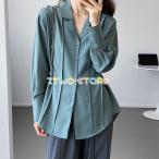 2色有り ブラウス レディース 長袖 シャツ トップス 襟付き ボタン ウエストマーク 無地 通勤 上品 大人カジュアル きれいめ 体型カバー M-L