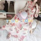 2色有り レディース ワンピース 7分袖 ロング丈 シフォンドレス 花柄 Vネック ハイウエスト ウエストマーク フェミニン 大きいサイズ 体型カバー M-2XL