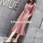 レディース ワンピース 長袖 ミドル丈 シャツワンピース シャツドレス 無地 ウエストマーク ベルト 上品 レトロ オフィス 体型カバー S-XL
