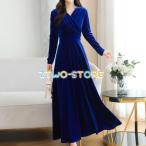 4色有り レディース ワンピース 秋冬 長袖 ロング丈 Vネック ゴールドベルベット ウエストマーク 無地 パーティードレス 結婚式二次会 体型カバー M-3XL