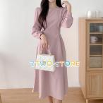 3色有り レディース ワンピース 長袖 ロング丈 ティアードスカート ケーキドレス ハイカラー パフスリーブ レトロ ウエストマーク ハイウエスト 無地