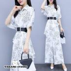 オールインワン レディース 大きいサイズ ジャンプスーツ パンツ ハイウエスト ワイドパンツ 袖フリル ウエストマーク 無地 シンプル ゆったり 体型カバー
