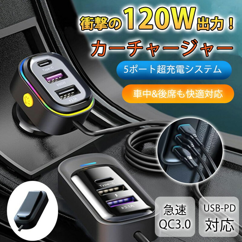 限定10%OFF★2点目半額★静かに満ちる電力★シガーソケット usb コンセント 充電器 おしゃれ iPhone/Android スマホ 急速充電 充電器 携帯 耐久性 便利グッズ 充電器 角度調整可能 180° 巻き取り式 充電ケーブル 4台同時利用 コンパクト カーチャージャー Type-C 充電器