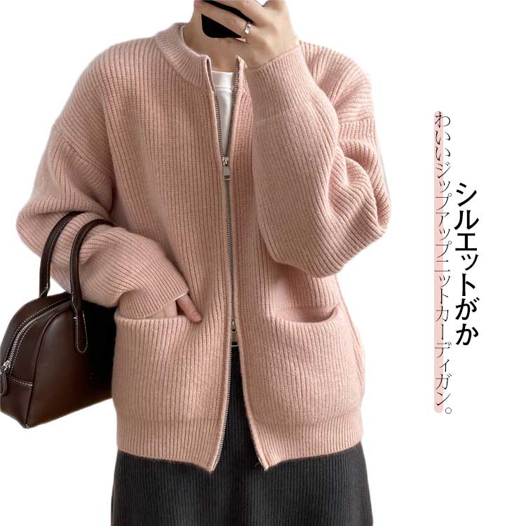 送料無料 ニットカーディガン レディース ジップアップ カーディガン クールネック 片畦編み 長袖 ニット 羽織り アウター トップス 前開き 厚手