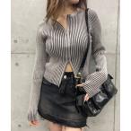 ニット セーター マルチボーダークロップドジップアップニット/フーディニットカーディガン/ニットパーカー レディース