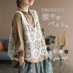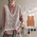 ベスト レディース 秋 トップス 透かし編み ニットベスト レース編み ショート丈 ノースリーブ プルオーバー 花柄 袖なし Vネック レイヤード 重ね着 ナチュラ