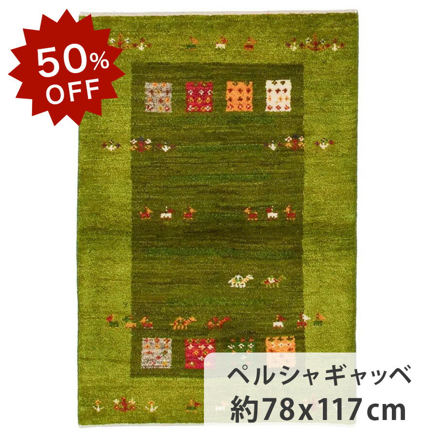 【50%OFF!楽天スーパーSALE限定!】 ペルシャギャッベ ファインクオリティ 約78cm x 117cm 玄関マット グリーン ウール 緑色 羊毛 天然 花柄 動物 ホットカーペット対応 床暖房対応 オールシーズン 一年中 一点もの 現品限り イラン製 春 夏 秋 冬 手織り