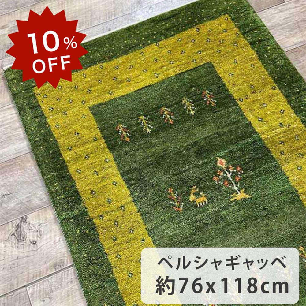 【10%OFF!楽天スーパーSALE限定!】ペルシャギャッベ 約76cm x 118cm 玄関マット ウール100% グリーン 緑色 生命の樹 ヤギ 花 羊毛 天然 ふかふか モコモコ 厚手 四角 現品限り ホットカーペット対応 床暖房対応 オールシーズン 一年中 ペルシャ製