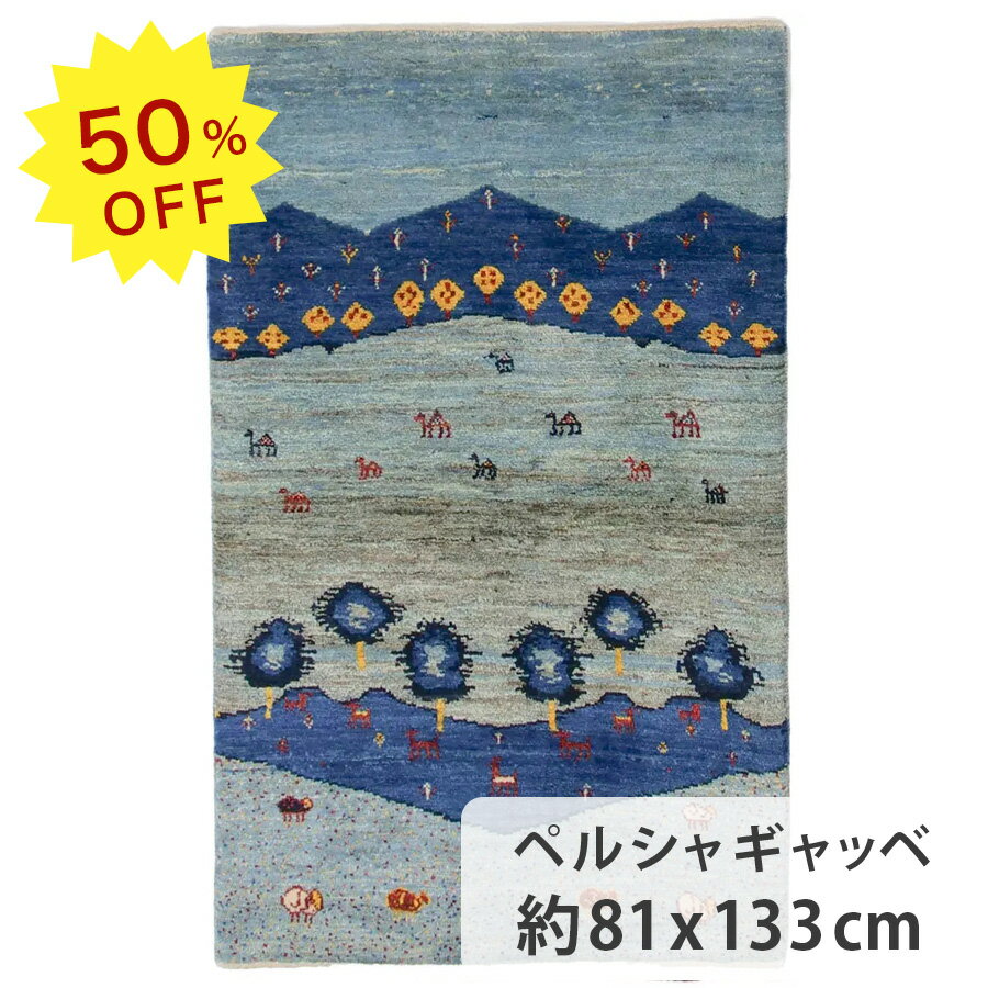 【50%OFF!楽天スーパーSALE限定!】ペルシャギャッベ ファインクオリティ 約81cm x 133cm 玄関マット ウール100% ブルー 青色 生命の樹 ヤギ ラクダ 羊毛 天然 ふかふか モコモコ 厚手 現品限り ホットカーペット対応 床暖房対応 オールシーズン 一年中 イラン製 手織り