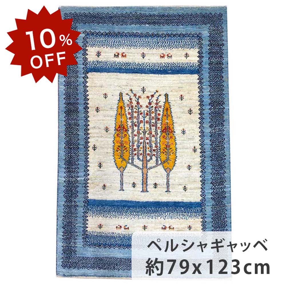 【10%OFF!楽天スーパーSALE限定!】ペルシャギャッベ ファインクオリティ 約86cm x 129cm 玄関サイズ ウール100% ブルー 青色 羊毛 天然 ふかふか モコモコ ナチュラル ホットカーペット対応 床暖房対応 オールシーズン 現品限り ペルシャ製 生命の樹 動物