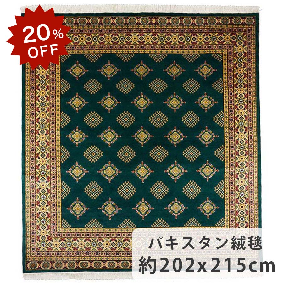 【20%OFF!楽天スーパーSALE限定!】パキスタン絨毯 約202cm x 215cm ダイニングサイズ 約2畳 正方形 グリーン 緑 ウール シルク 羊毛 絹 サラサラ ツヤツヤ 幾何学模様 ホットカーペット対応 床暖房対応 オールシーズン 一年中 じゅうたん らぐ パキスタン製 高級 一点物