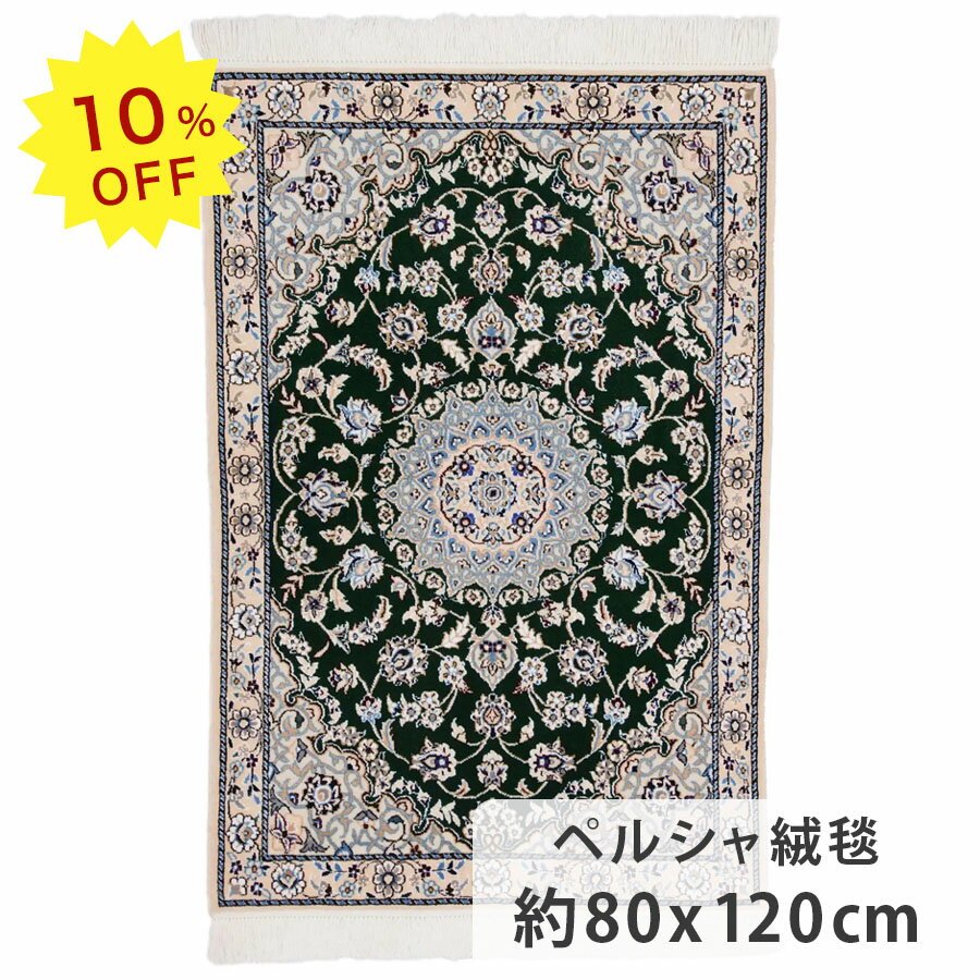 【10%OFF!楽天スーパーSALE限定!】ペルシャ絨毯 ナイン産 約80cm x 120cm 玄関マット グリーン 緑色 メダリオン 唐草模様 ウール シルク 羊毛 絹 かわいい おしゃれ 高級 ホットカーペット対応 床暖房対応 オールシーズン 一年中 現品限り 一点もの ペルシャ製 手織り