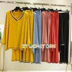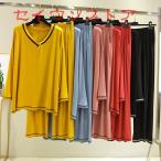 2点セット Vネック ゆるカットソー 長袖 ワイドパンツ カラバリ 配色 トップス ボトムス