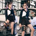 黒 ブレザー キッズダンス衣装 セットアップ 女の子 長袖 ロングジャケット ベルト ショートパンツ キャミソール 韓国 k-pop ダンス衣装 女の子 ガールズ チアダ