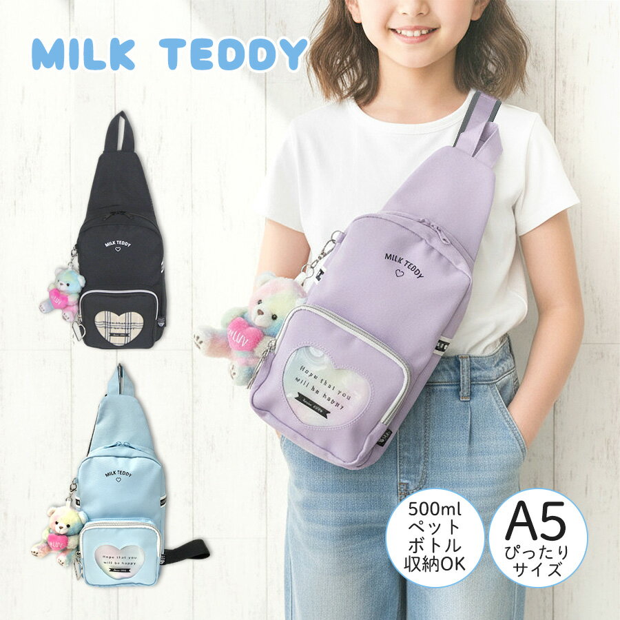 ボディバッグ キッズ 女の子 子供 小学生 かわいい ぬいぐるみ ペットボトル収納 軽量 sle-641 MILK TEDDY ミルクテディ ワンショルダーバッグ 女子 可愛い くま 幼稚園 保育園 小学校 低学年 高学年 シンプル 旅行 習い事 お出かけ ブラック パープル ライトブルー