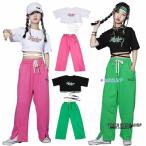 子供ダンス 女の子 ヒップホップ へそ出し tシャツ グリーン ピンク スウェットパンツ キッズダンス衣装 ロングパンツ セットアップ 韓国 ジャズダンス衣装 上