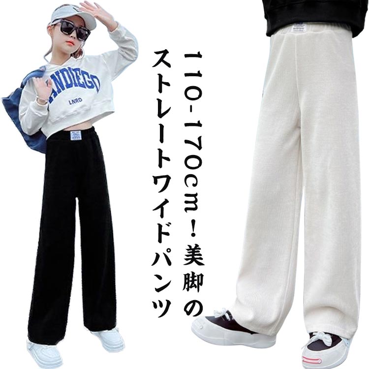 秋 ワイドパンツ キッズパンツ ブラック ウエストゴム キッズ 女の子 ストレートパンツ ジュニア ロング丈 ポケット付き 子供服 長ズボン ボトムス シンプル コーデュロイ 無地 カジュアル おしゃれ 保育園 幼稚園 お出かけ ワイドパンツ オフホワイト 春