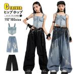 キッズ へそ出し トップス ダンス衣装 女の子 セットアップ デニム タンクトップ デニムパンツ 黒 カーゴパンツ かっこいい ヒップホップ 韓国 k-pop衣装 アイド