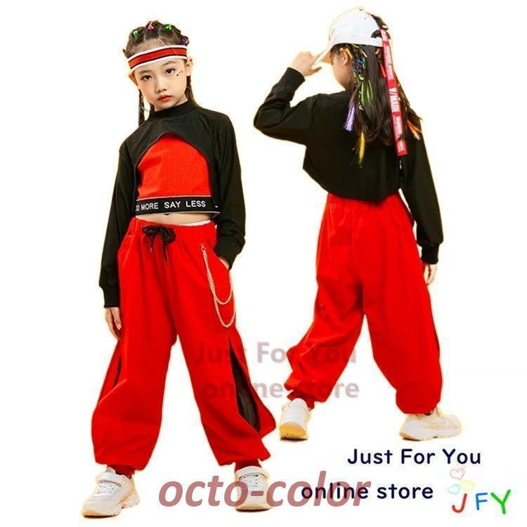 【期間限定10%OFF】キッズ ダンス 衣装 ヒップホップ ジュニア 女の子 パーカー パンツ タンクトップ ベスト へそ出し 韓国 子供服 おしゃれ 黒パーカー 赤パンツ 舞台衣装 ダンス