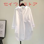 シャツブラウス チュニック ホワイトシャツ 丸め裾 デザイン サイドスリット 襟付き 長袖 レディース トップス