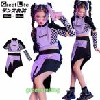 キッズ ダンス衣装 セットアップ チェック柄 紫 へそ出し スカート パープル 上下セット k-pop衣装 カッコイイ ヒップホップ 子供 演出服 キッズダンス衣装 ジャ