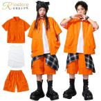 ダンス 衣装 キッズ オレンジ ヒップホップ セットアップ 男の子 女の子 半袖 シャツ ハーフパンツ チェック柄 ヒップカバー 腰巻き 韓国 KPOP ストリート系 上