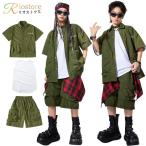 キッズ ダンス衣装 男女 ヒップホップ セットアップ カーキ 緑 半袖 シャツ ハーフパンツ チェック柄 ヒップカバー 腰巻き風 韓国 KPOP ダンス衣装 ストリート系