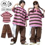 ボーダー柄 キッズダンス ヒップホップ ポロ襟 ポロシャツ ピンク Tシャツ 半袖 茶色 カーゴ パンツ ブラウン 子供服 ダンス セットアップ 単品 キッズダンス衣