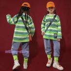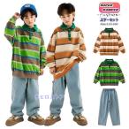 キッズ ダンス衣装 ヒップホップ キッズ ダンス 衣装 長袖 tシャツ ポロシャツ ボーダー柄 グリーン キャラメル ジーパン ジーンズ デニムパンツ ワイドパンツ