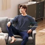 パジャマ メンズ 春 夏 長袖 綿100% 柔らかく軽い薄手の快適Tシャツパジャマ 上下セット ボーダー グレー/ネイビーブルー/ネイビーホワイト