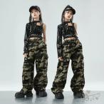 迷彩柄パンツ ブラック キッズ ダンス衣装 ガールズ 女の子 へそ出しシャツ かっこいい ヒップホップ 子供服 チアガール ジャズダンス セットアップ トップ スロングパンツ 上下セット HIPHOP jazz ストリート 発表会 演出服 団体服 練習着 応援団 通園 通学 普段着 夏用