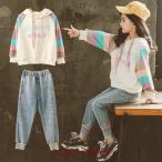 子供服 セットアップ キッズ 女の子 春秋 長袖 2点セット 上下セット Tシャツ デニムパンツ ロングパンツ ジュニア おしゃれ カジュアル 可愛い 新品 150 160cm