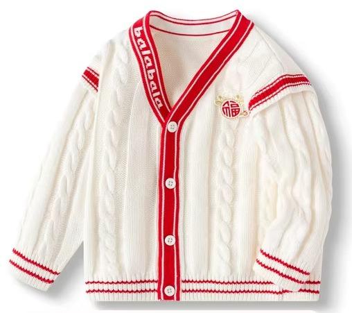 キッズ カーディガン 男の子 ベビー おしゃれ トップス ウール 春秋 ニット 長袖 vネック 羽織り ボタン カジュアル ワッペン ライン 白
