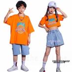 キッズダンス衣装 オレンジ tシャツ 半袖 デニム 短パン ダメージ 韓国 子供服 男の子 女の子 セットアップ ダンス 衣装 ヒップホップ キッズ キッズダンス ダ