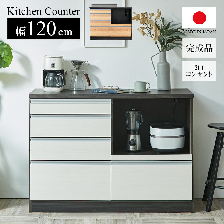 【全商品に使える10%offクーポンあり!!】 キッチンカウンター 120cm 日本製 キッチン収納棚 ロータイプ おしゃれ 国産 引き出し収納 幅120cmモダン 収納 引出し コンセント付き スライドレール フルスライド MDF 強化シート プリント紙化粧繊維板