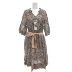 未使用品 キャシャレル cacharel タグ付き 五分袖シアーワンピース ひざ丈 総柄 リボンベルト 36 紺 ネイビー ベージュ /GV ■GY60 レディ