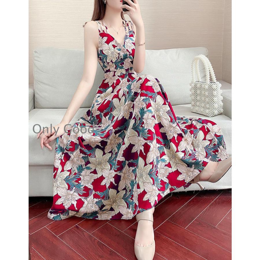 【期間限定10%OFF】ワンピース キャミソール ロング 花柄 フラワー キャミワンピ レディース ウエストゴム ワンピ ハイウエスト プリント ビーチ 旅行 2023夏新作 涼しい