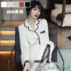 パジャマ レディース 春夏秋 前開き 2点セット ルームウェア レース 長ズボン 長袖 シルク 大きいサイズ ナイトガウン セットアップ 部屋着 おしゃれ 可愛い
