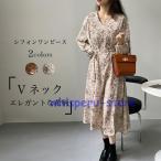 シフォンワンピース 花柄 レトロ レディース 長袖ワンピース Vネック 春 秋 ワンピース エレガント ロングワンピ ゆったり ベルト付き 柄ワンピ