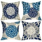 【並行輸入品】Fjfz ダークブルー グレー ダリア 装飾クッションカバー 18 x 18 4枚セット 大きな花 花柄 幾何学模様 モダンアート