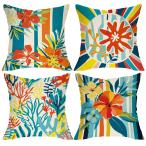 【並行輸入品】Fjfz トロピカルフラワー装飾クッションカバー 18×18 4枚セット カラフルなハイビスカス 花柄 葉 サンゴポーチ アウトド