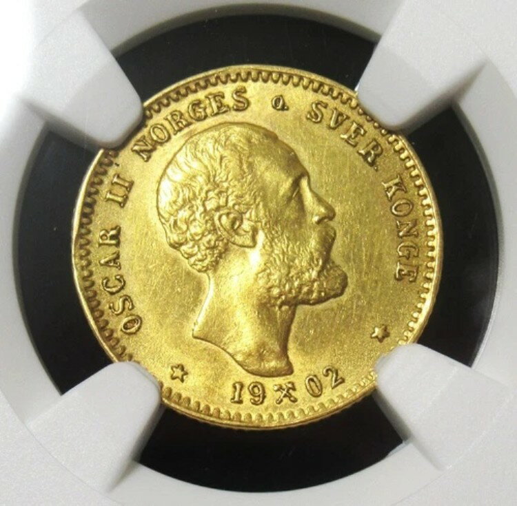 ノルウェー オスカー II ゴールド 10 クローネ 1902 コングスベルク ミント AU 詳細 NGC
