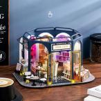 リアルな家具キットを備えたミニチュアドールハウス、LEDライトとバッテリーケースDIYミニブックとコーヒーハウスウッドクラフトカフェストアお
