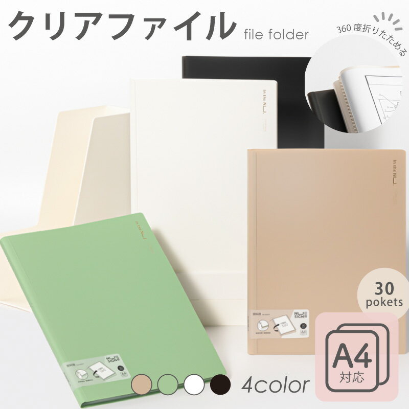 ★月末10%OFFクーポン★クリアファイル A4 30ポケット おしゃれ ベージュ グリーン ホワイト ブラック 360度折りたためる