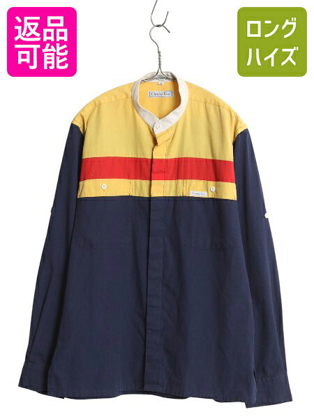 80s クリスチャン ディオール バンドカラー デザイン シャツ メンズ M / ヴィンテージ 長袖シャツ ワンポイント ロールアップ トリコロール| 中古 80年代 Christian Dior ビンテージ 長袖シャツ コットンシャツ ノーカラー ボックス シルエット イエロー レッド ネイビー