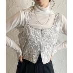 ベスト ジレ 深Vネックショート丈フェザージャガード/テープヤーンフリンジベスト レディース